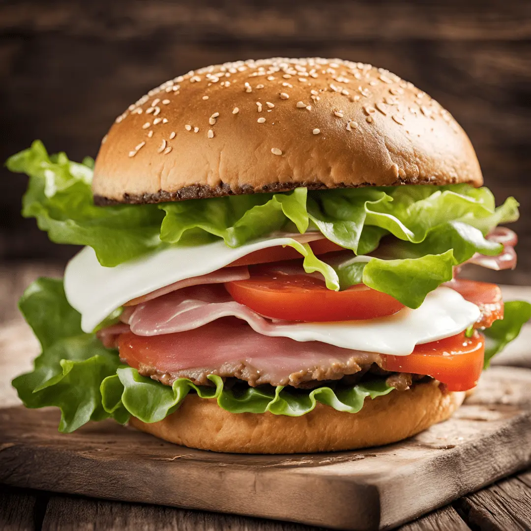PĆ£o de fermento natural de trigo, carne bovina, presunto, mussarela, alface e tomate