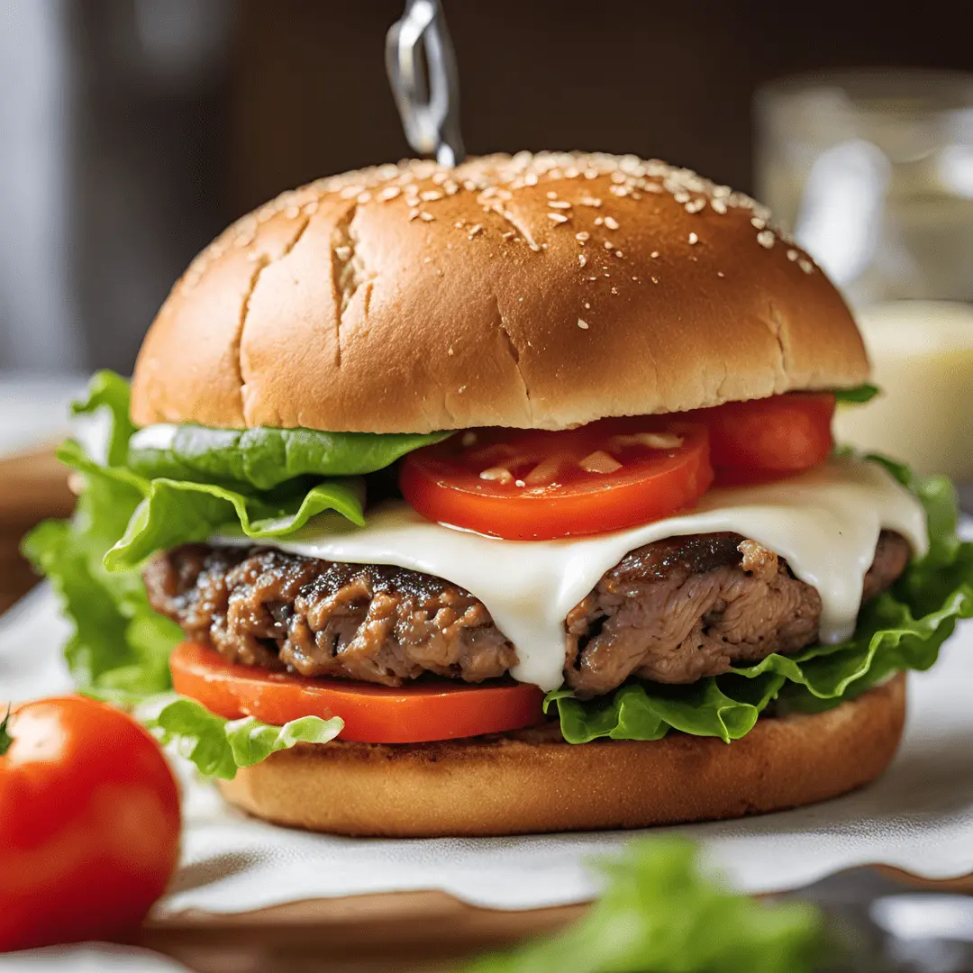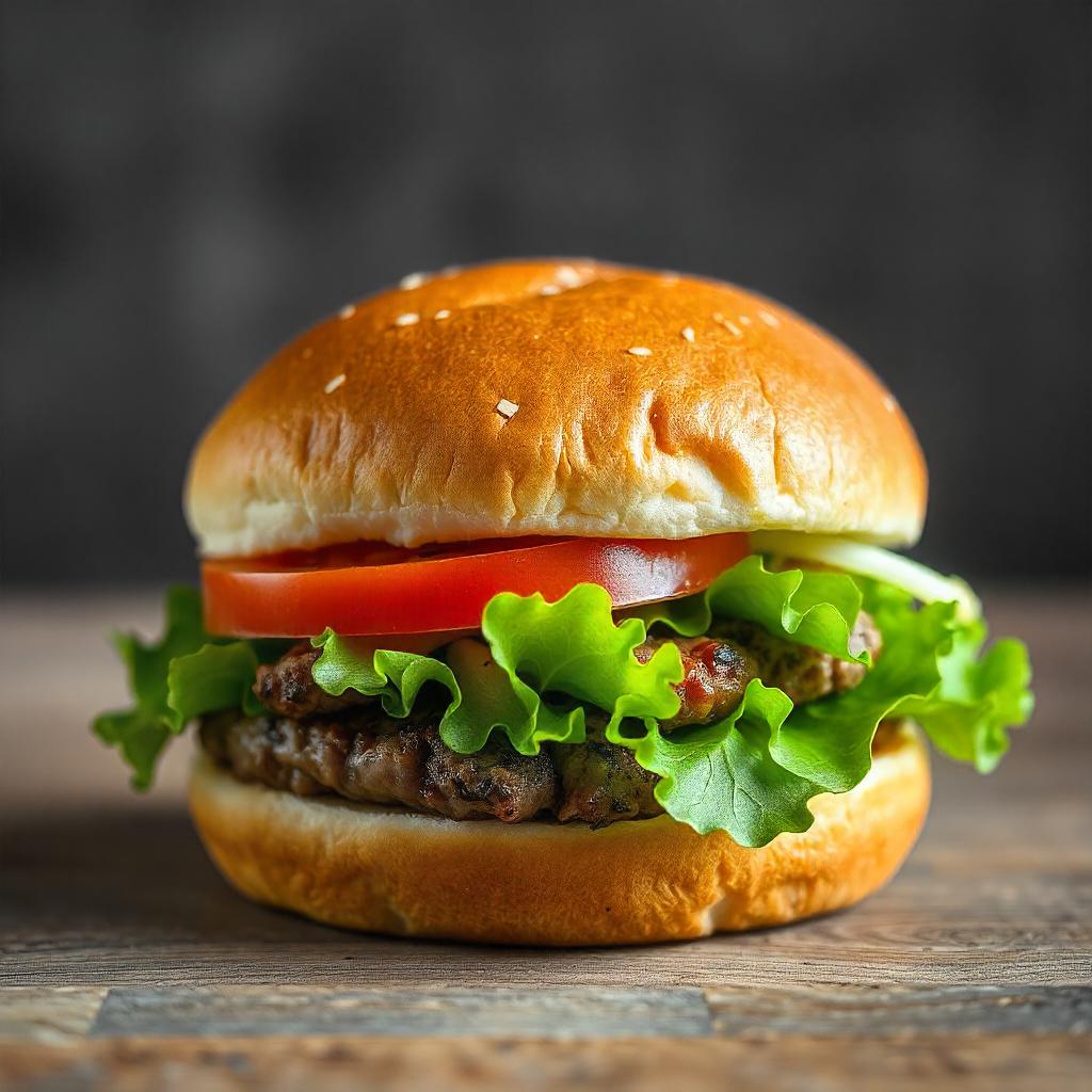 PĆ£o de fermento natural de trigo, carne bovina, mussarela, alface e tomate